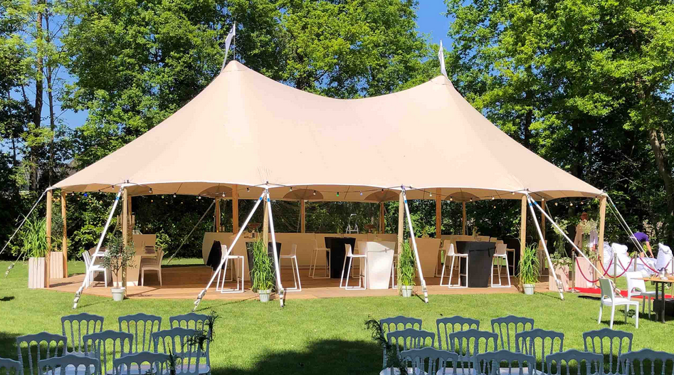 Elevate your event with the timeless elegance of a sailcloth tent. Featuring translucent fabric that glows at sunset and rustic wooden poles for natural charm, it creates a warm, inviting atmosphere unlike any other. Perfect for weddings, galas, and upscale gatherings, our sailcloth tents blend sophistication with open‑air freedom.